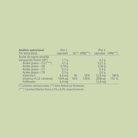 INGREDIENTES: Aceite de espino amarillo (Hippophae rhamnoides) enriquecido (SevenAX®), cápsula (gelatina de almidón, tapioca, humectante (gelatina vegetal), agua).
