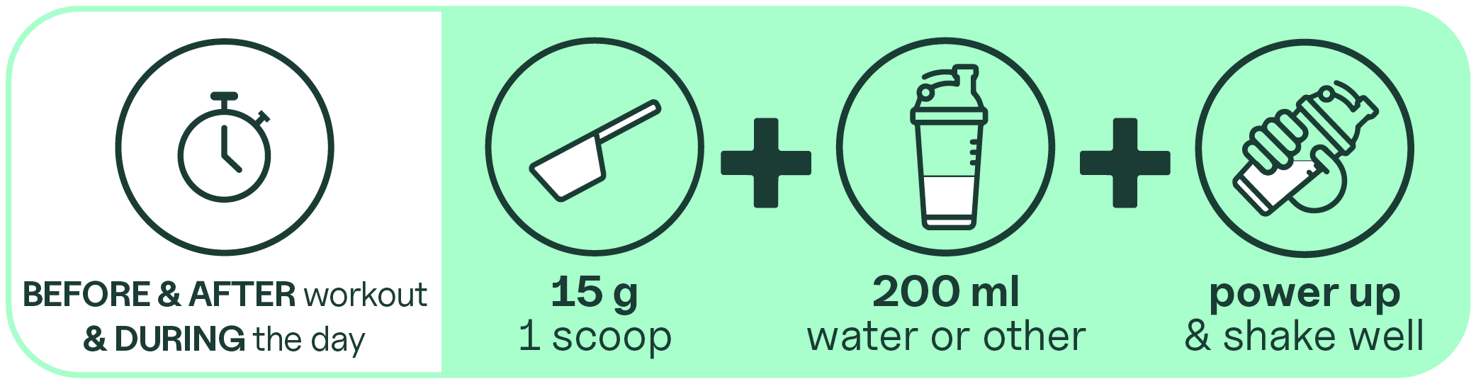 MODO DE USO: Mezclar 15 g (= 1 cacito) con 200 ml de agua, sopa o cualquier otro plato o bebida de su elección. Tomar an-tes o después del ejercicio o durante el día.